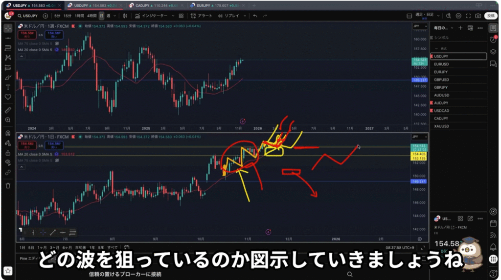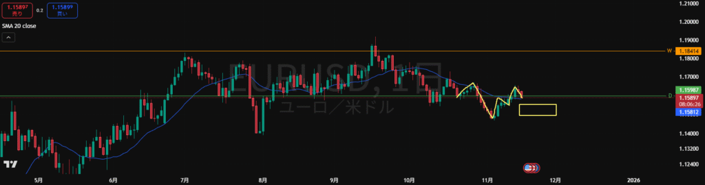 ・緑ラインが売り抑えライン。MAを上抜いていて買い支えられやすい状況。ダウが2通りあり、黄色ダウだと上昇トレンド中。ピンクダウだと下落の戻し過ぎ。週足はMAに抑えられようとしているところ、日足は買い支えられやすいところで値動きが難しくなりそうなのが考えられる。