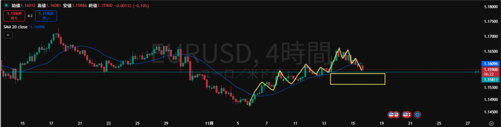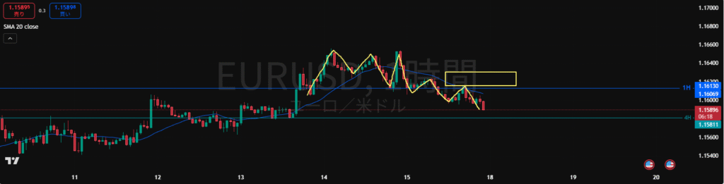 4H足を上方向では視ているものの、1H見ると積極的に買っていける状況ではないので様子を視ていく