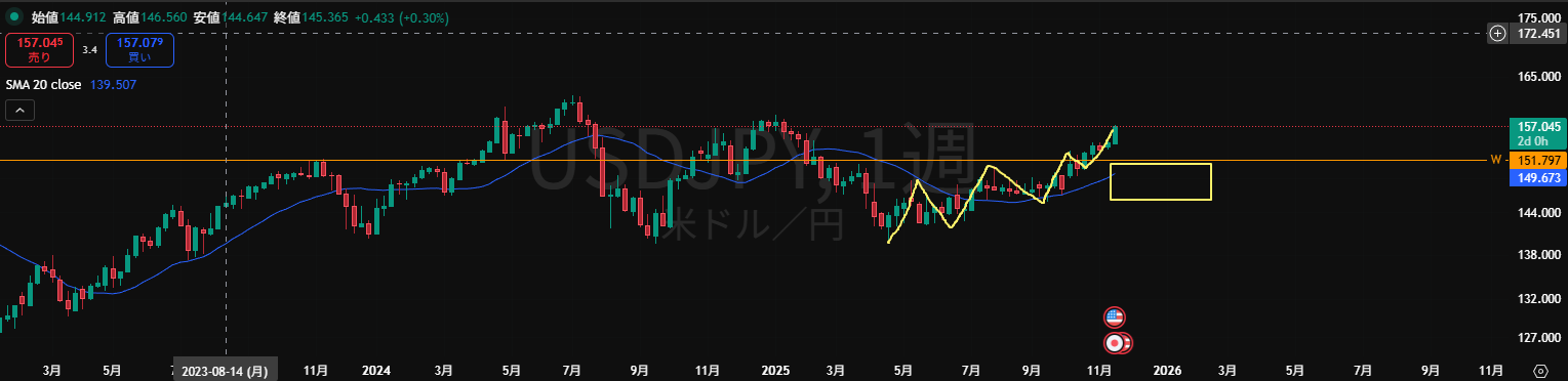 ・オレンジの水平線は押し目買いライン。下には押し目買い勢力がいる。MAも上向きで買い支えられやすい