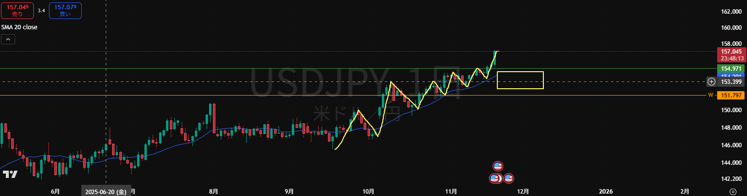 ・緑の水平線は買い支えライン。MAも下向きで売り抑えとして機能しやすい。四角には買い支え勢力がいる
