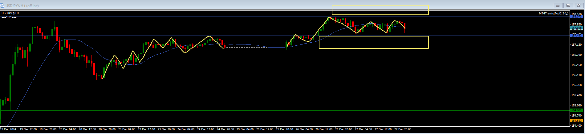 ・上の青ラインは売り抑えライン。下の青ラインは買い支えライン。MAを中心に方向感なく調整中